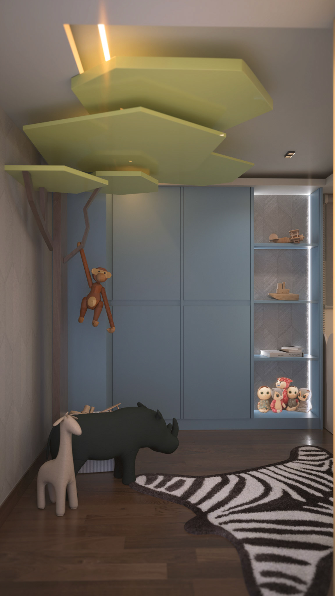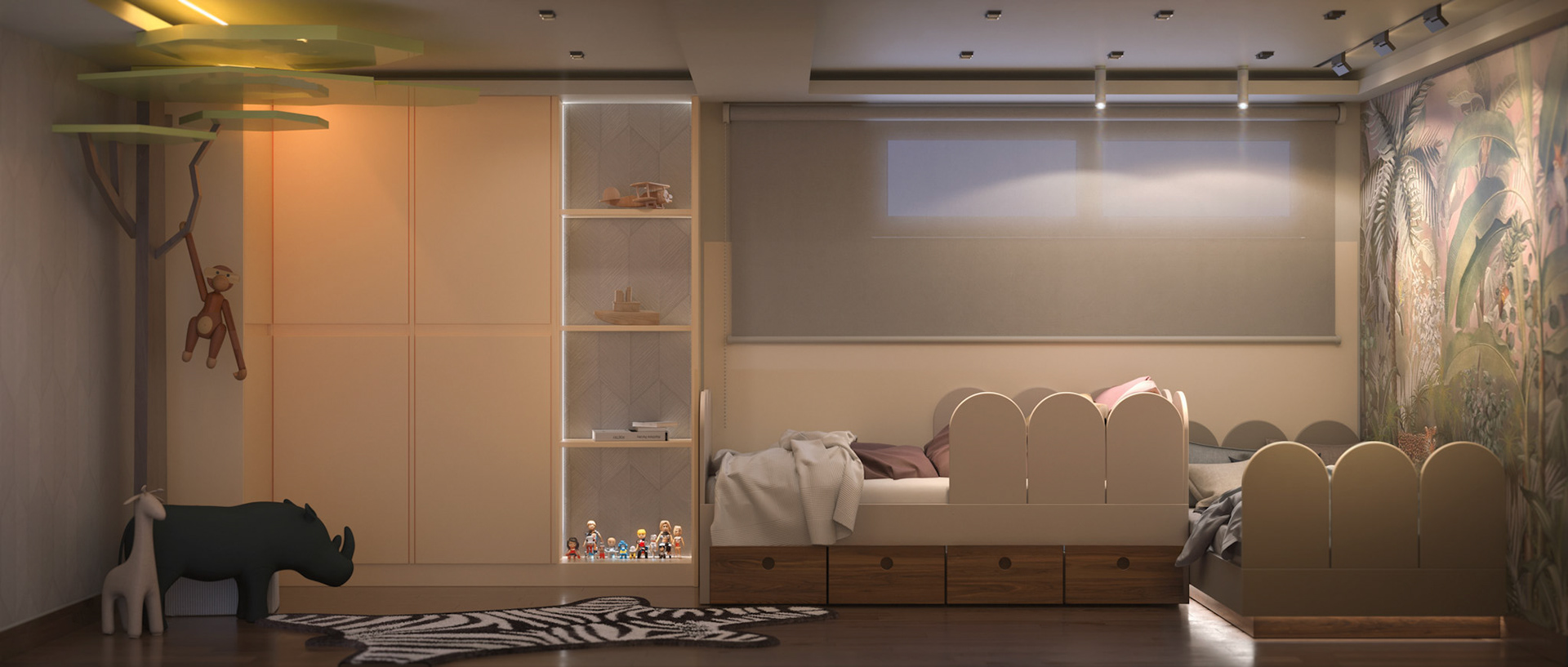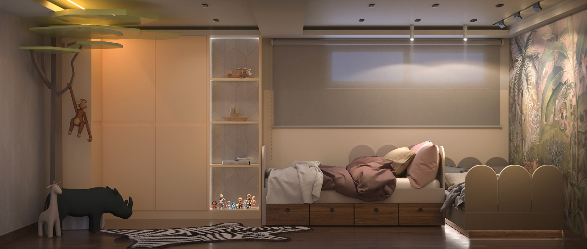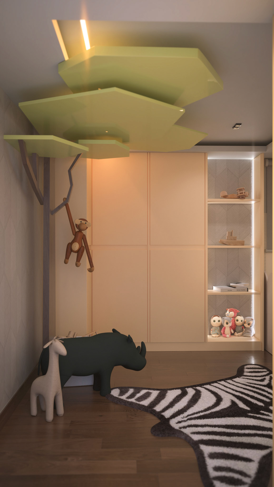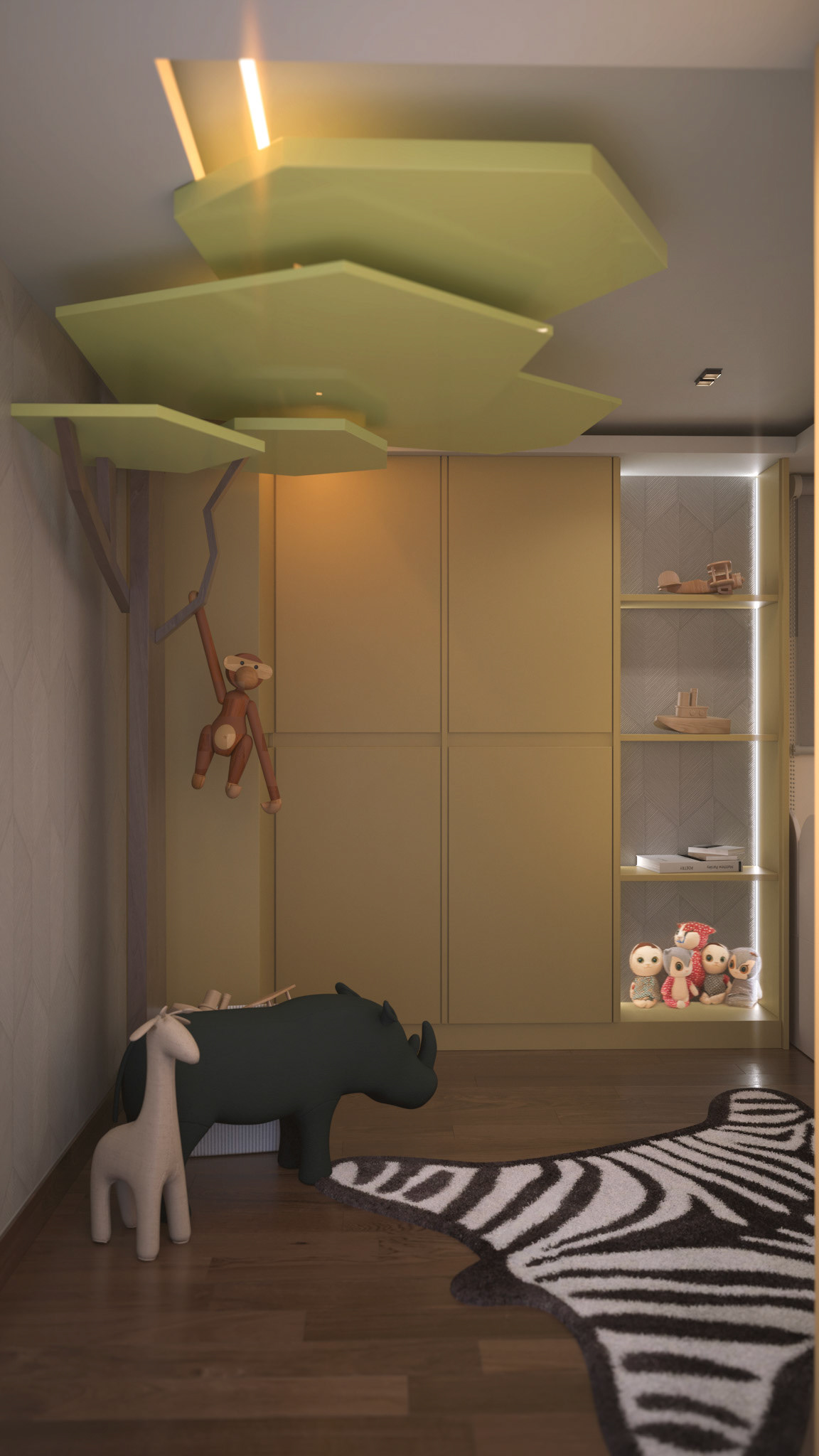 Commissioned for a newly acquired residence, A & H's Room focuses on the interior renovation of a shared children's bedroom. The brief called for a gender-neutral spatial strategy suitable for siblings of different sexes, steering clear of cliché thematic elements. The intervention included a chromatic analysis of existing furnishings and the fabrication of bespoke joinery for the beds and ceiling features. The design employs a warm tropical palette and a layered lighting plan to create a cozy atmosphere, elevating a generic residential space into a playful, custom-designed sanctuary.