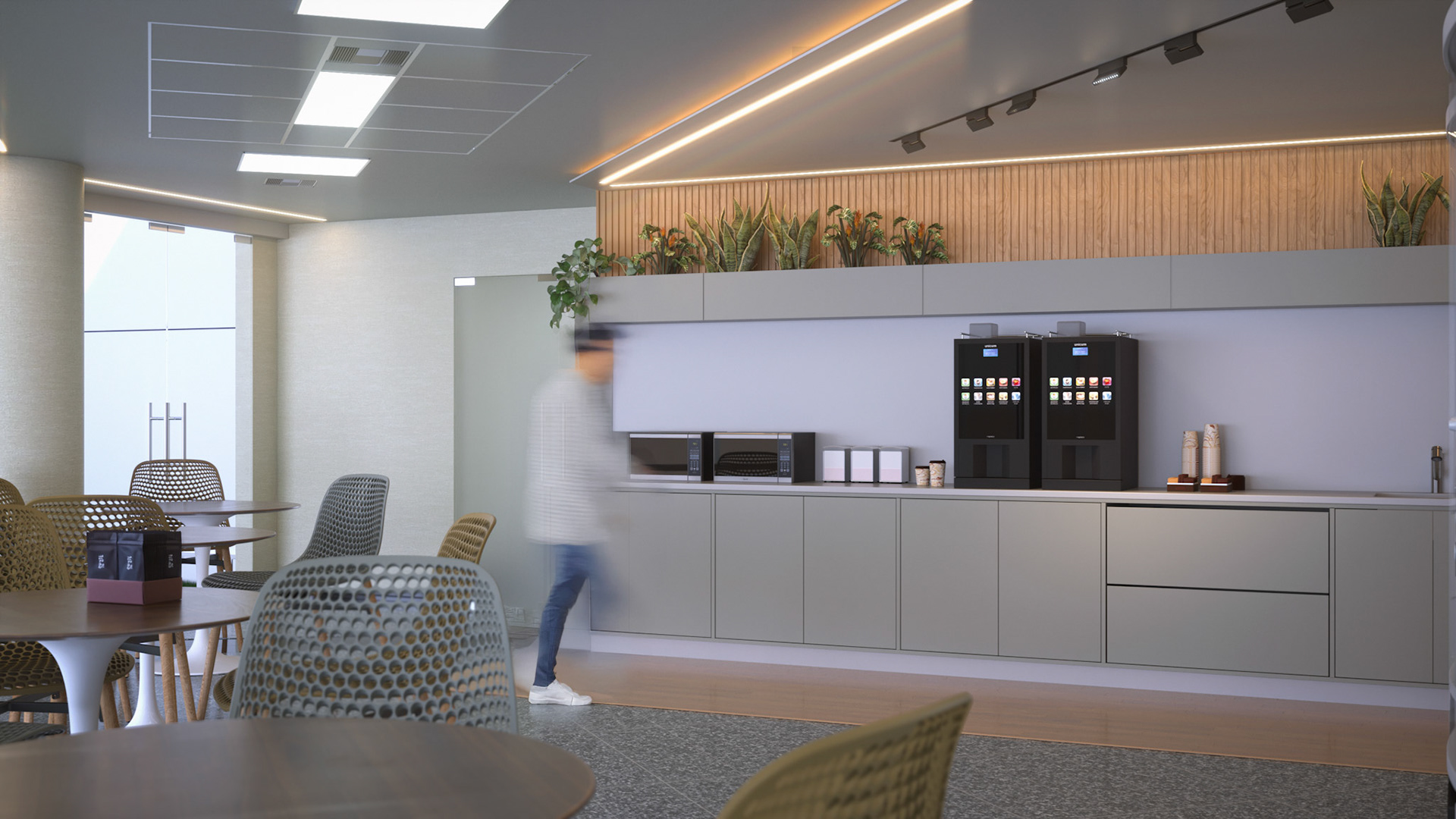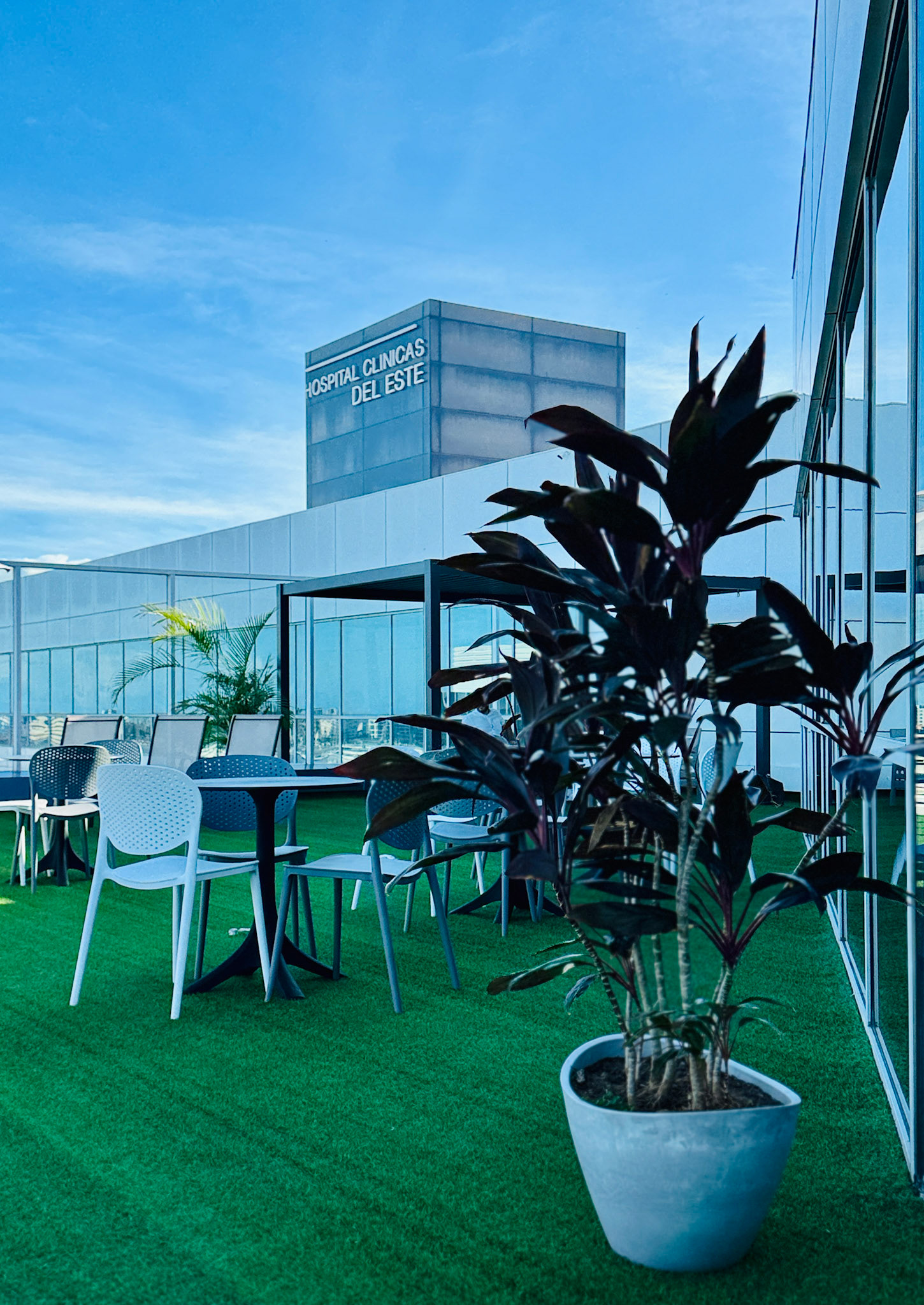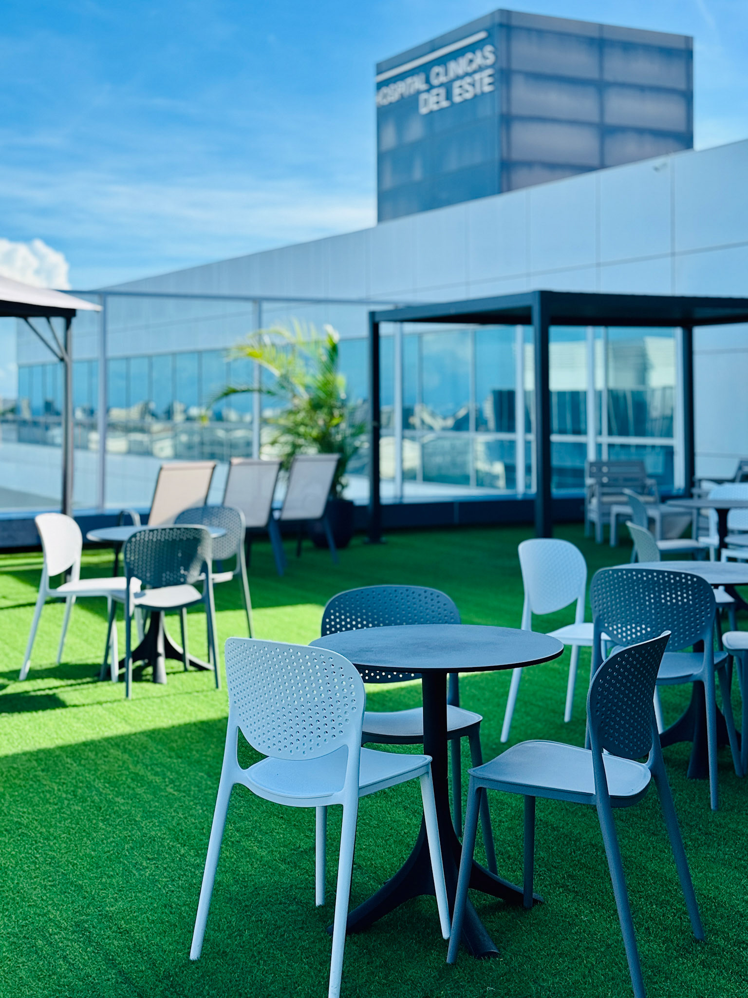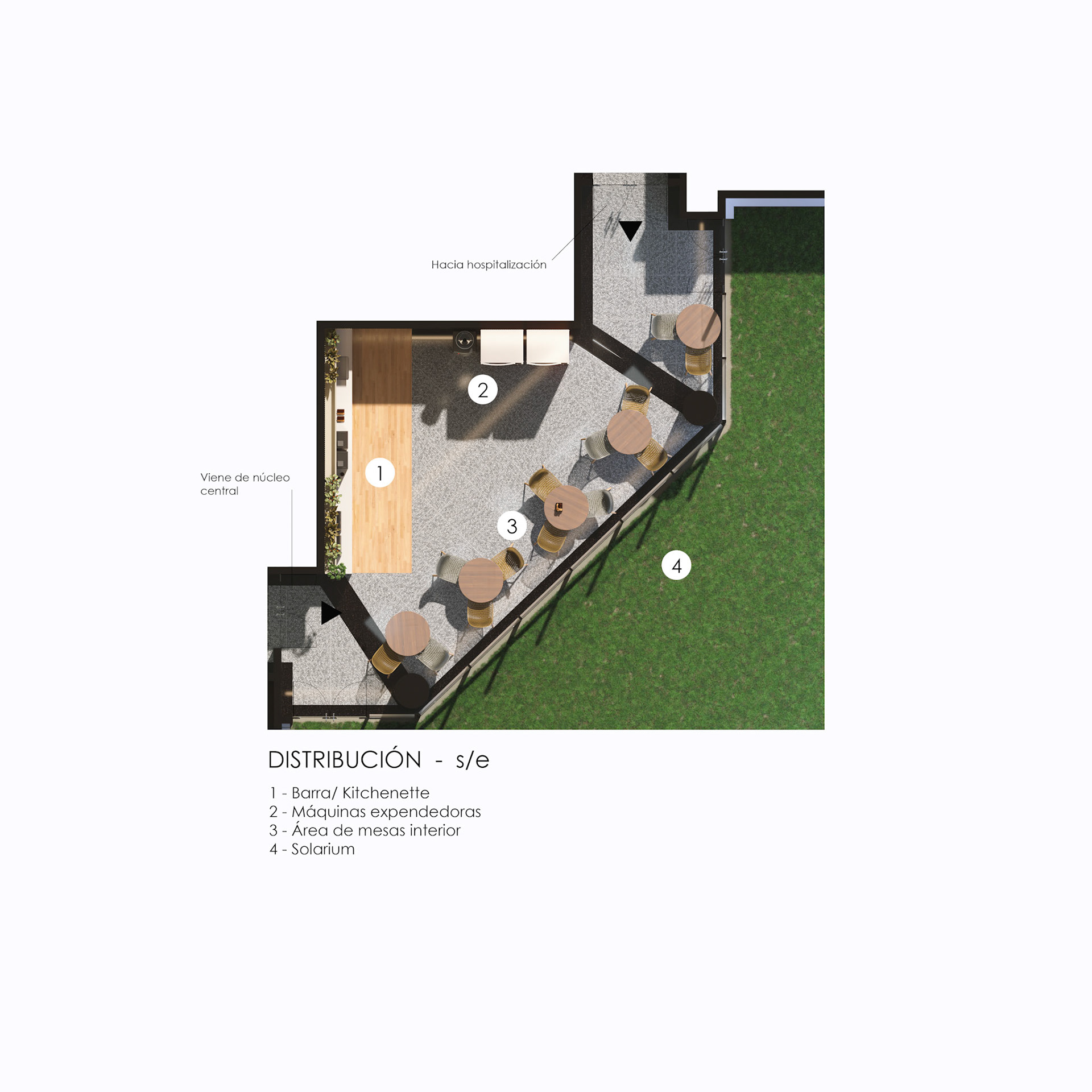 Located on the fourth level of the Hospital Clinicas del Este, Cafe Solarium is an adaptive reuse intervention transforming a residual circulation area into a vital social amenity. The project functions as a strategic distribution hub, articulating the flow between vertical circulation nodes, the inpatient ward, and the exterior "Solarium" terrace. Architecturally, the design prioritizes a human-centric approach to healthcare environments. By introducing a material palette of warm woods and a curated, soft lighting strategy, the intervention counteracts the clinical sterility of the hospital, providing a comforting sanctuary for patients' families.