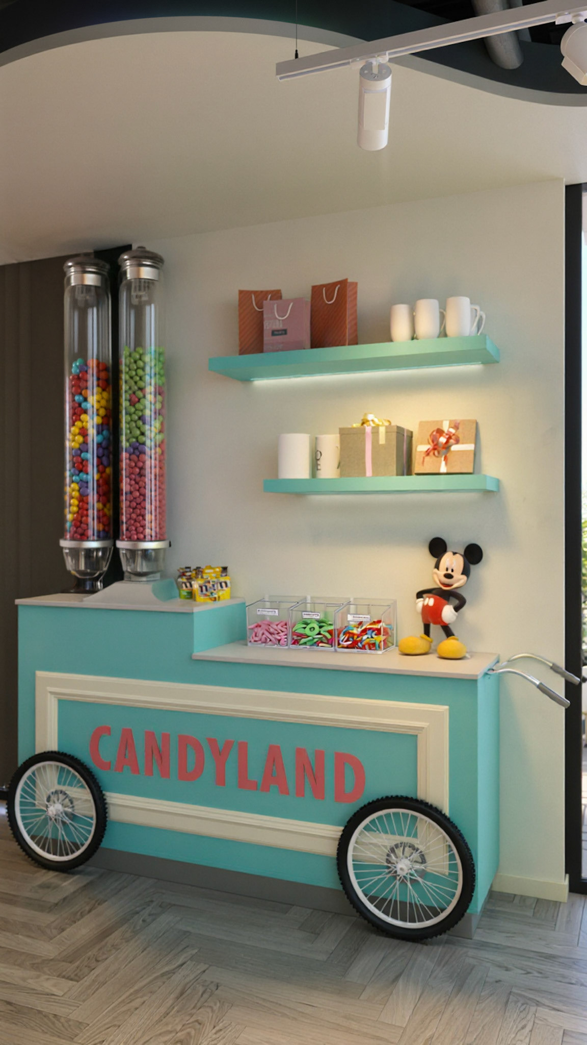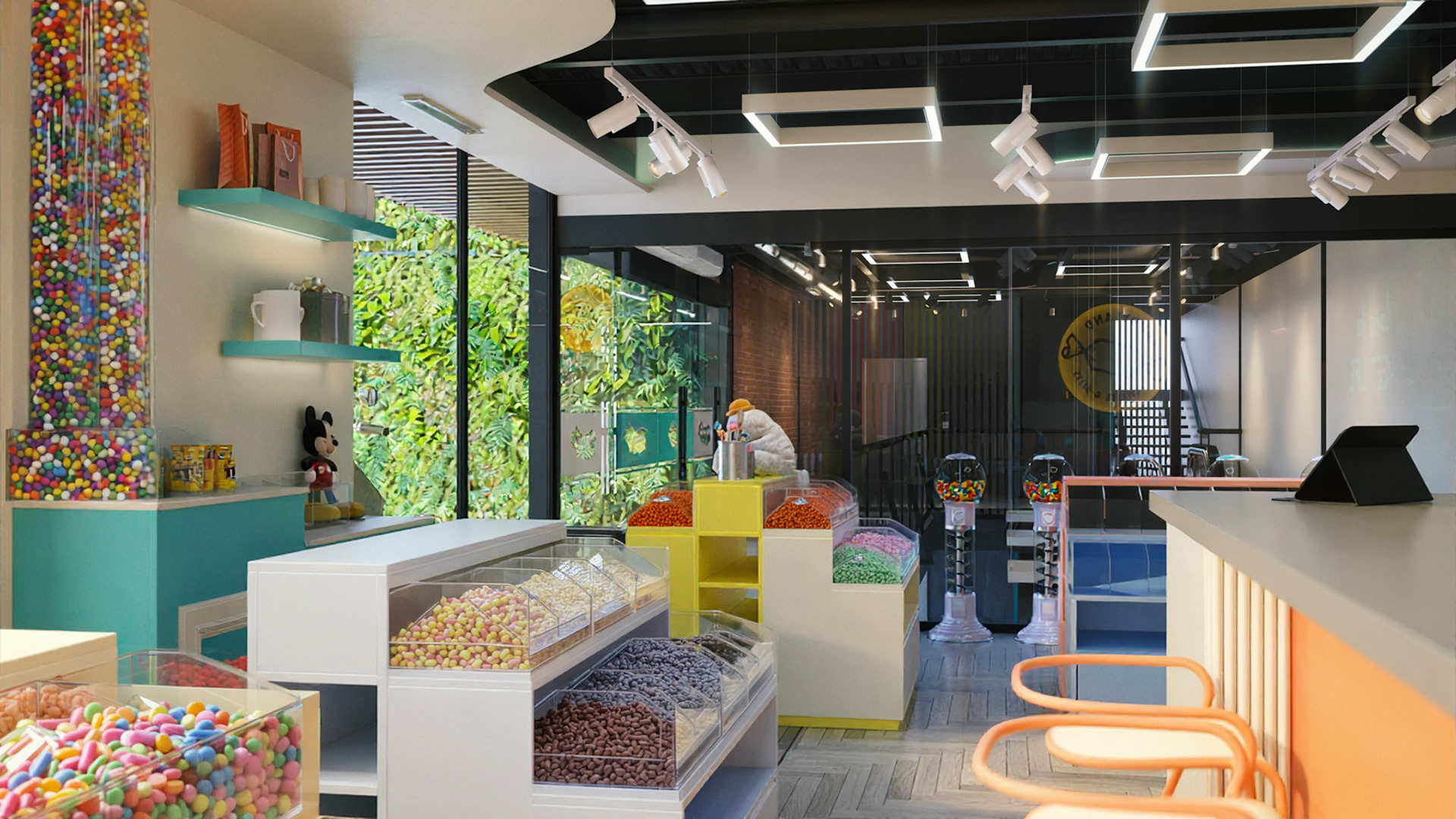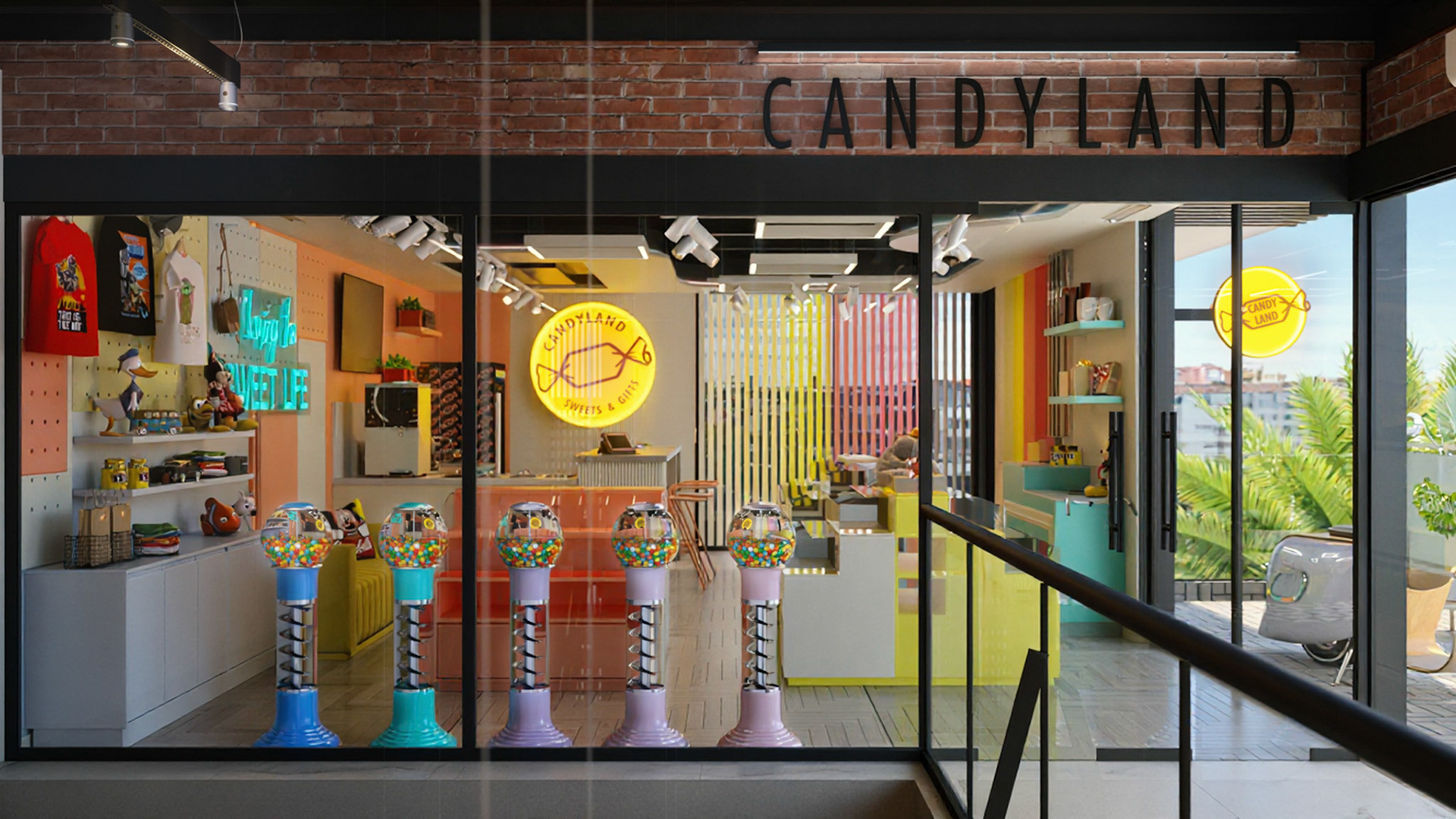 Located in a premier commercial center on Margarita Island, Candyland reinterprets the retail candy shop typology through a minimalist contemporary lens. The design strategy employs a soft pastel chromatic palette to generate a playful, child-centric environment without visual clutter. The functional layout includes custom acrylic display systems for confectionery, integrated merchandising zones for apparel and souvenirs, and a self-service frozen yogurt station. The project successfully balances a clean, simple aesthetic with the vibrancy required for a family-oriented commercial space.