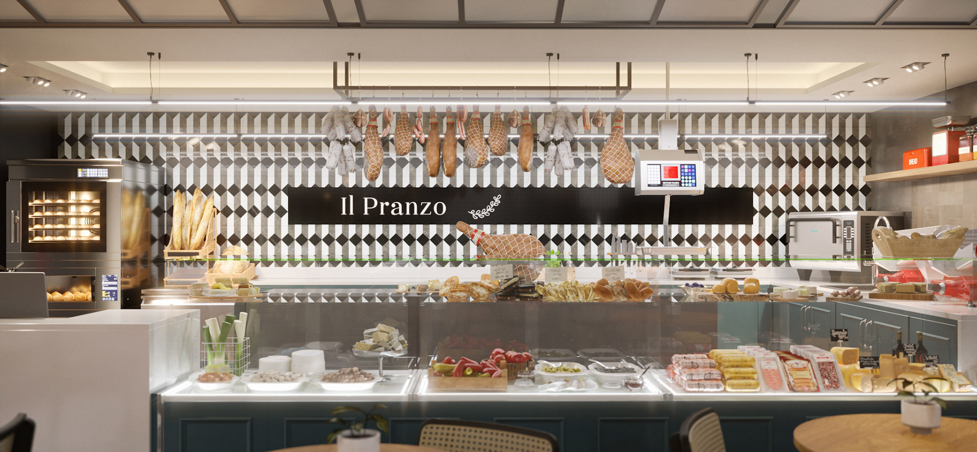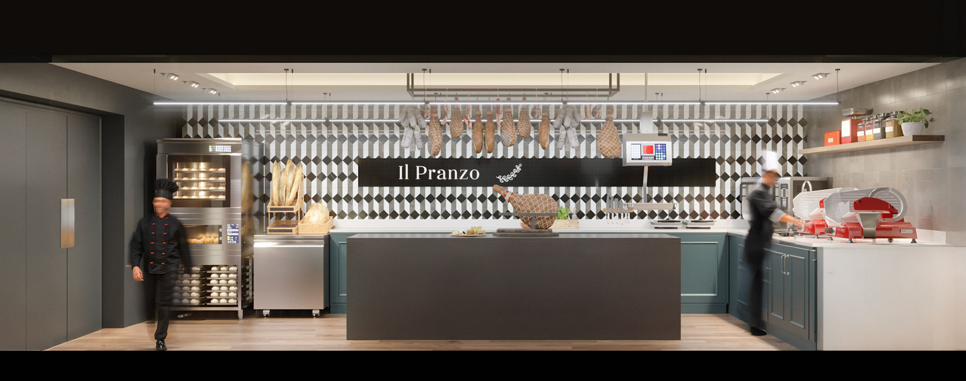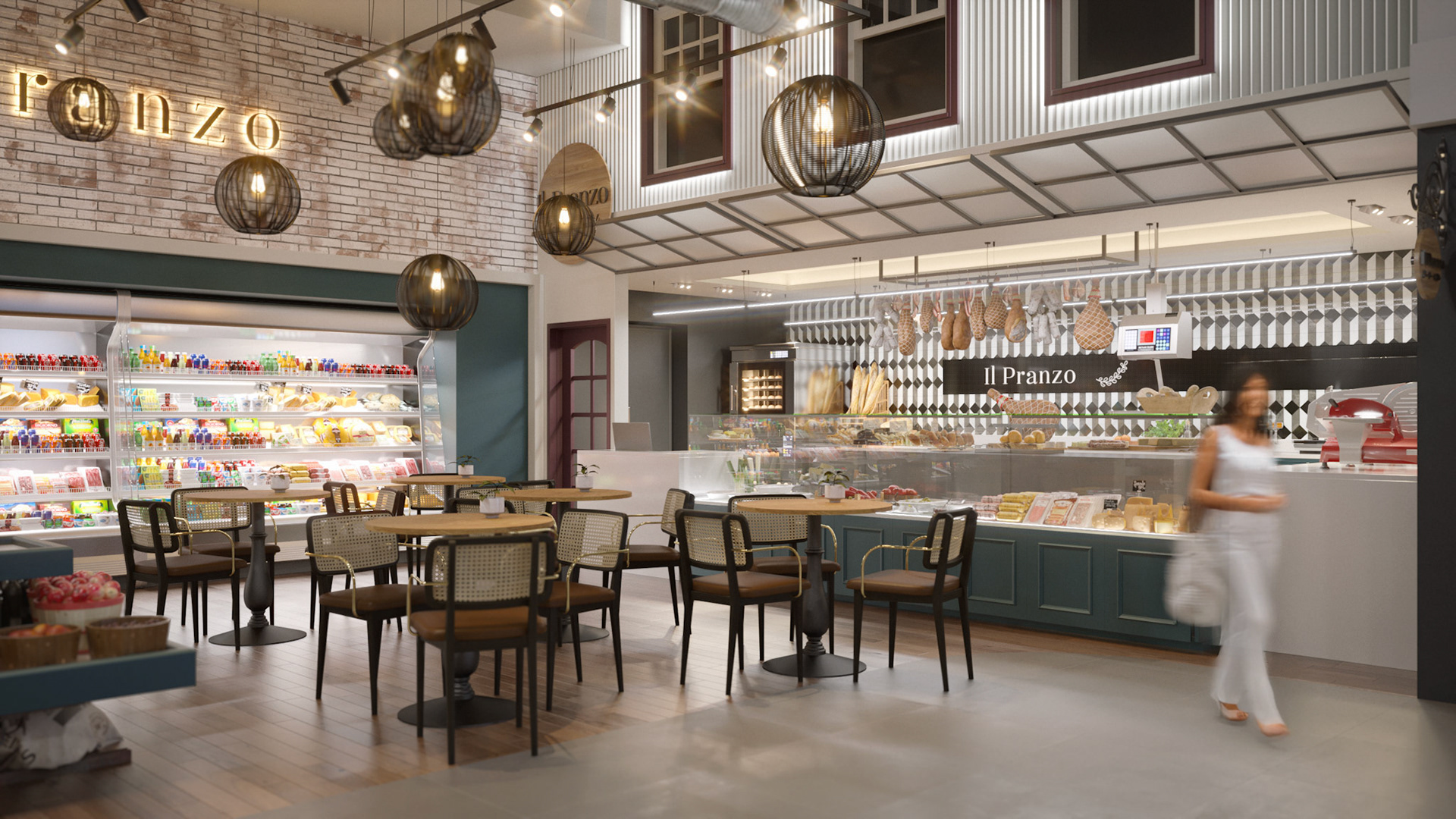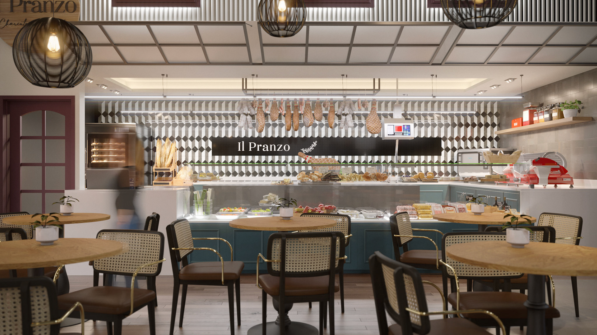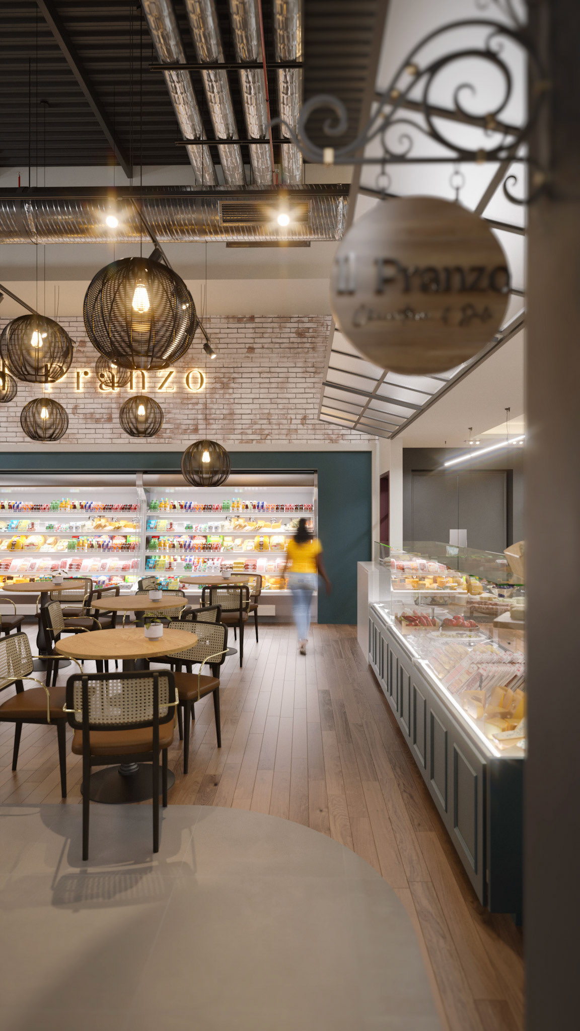 Situated within a separate zone of the same commercial footprint as Salumeria, Il Pranzo serves as a distinct variation of the project's culinary typology. Diverging from the industrial theme of its counterpart, this intervention adopts a classical European design language. The scope is significantly expanded to accommodate a multifaceted program, which includes retail gondolas, a sandwich exhibition counter, a table service area, and an integrated boutique flower shop.