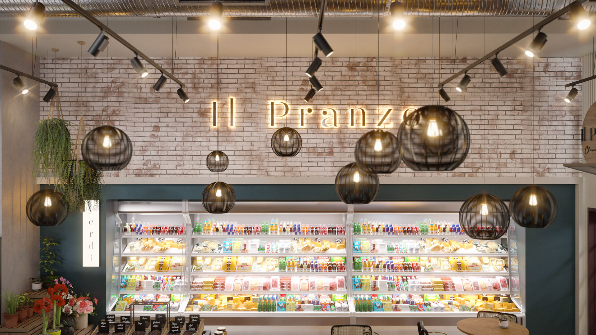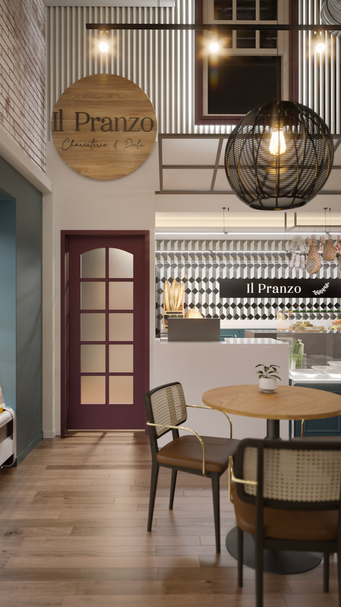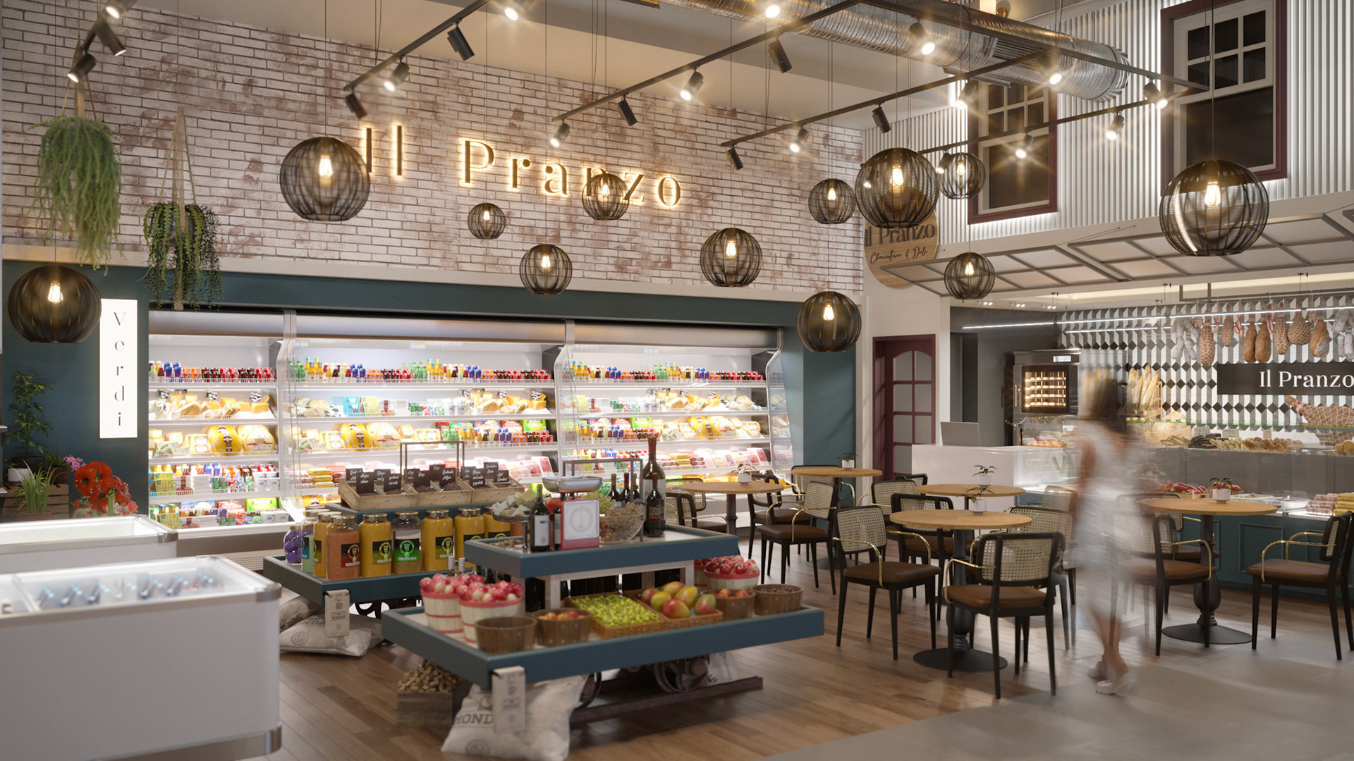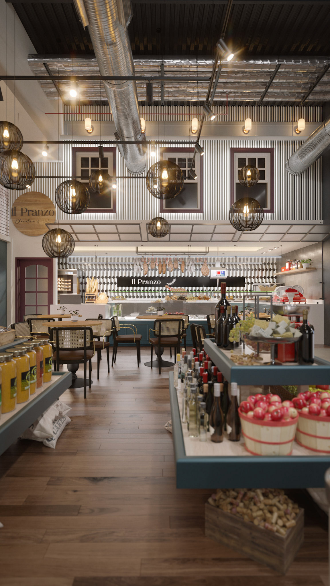 Situated within a separate zone of the same commercial footprint as Salumeria, Il Pranzo serves as a distinct variation of the project's culinary typology. Diverging from the industrial theme of its counterpart, this intervention adopts a classical European design language. The scope is significantly expanded to accommodate a multifaceted program, which includes retail gondolas, a sandwich exhibition counter, a table service area, and an integrated boutique flower shop.