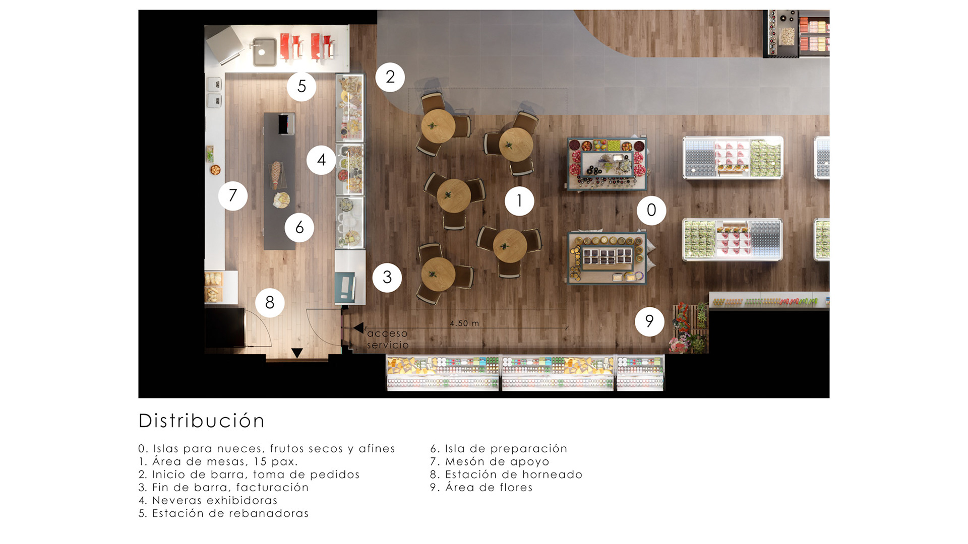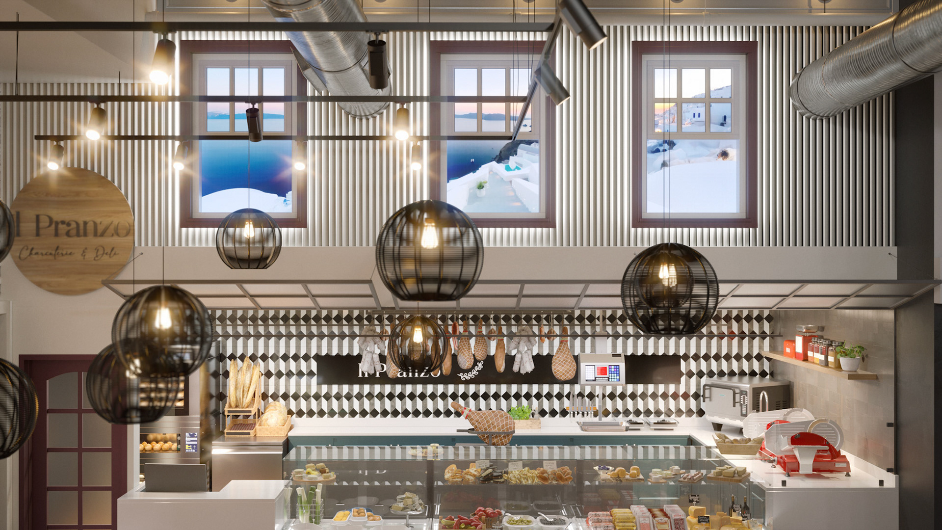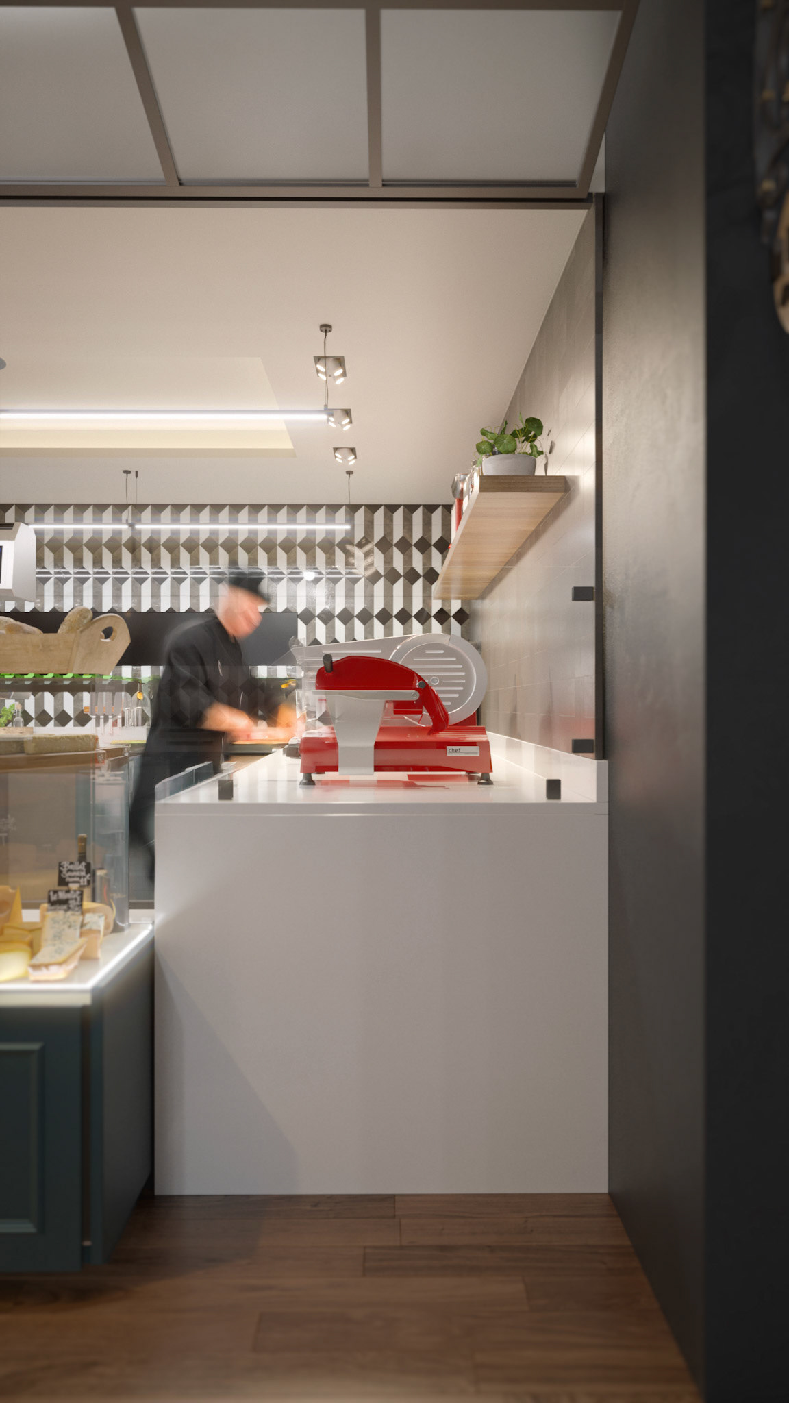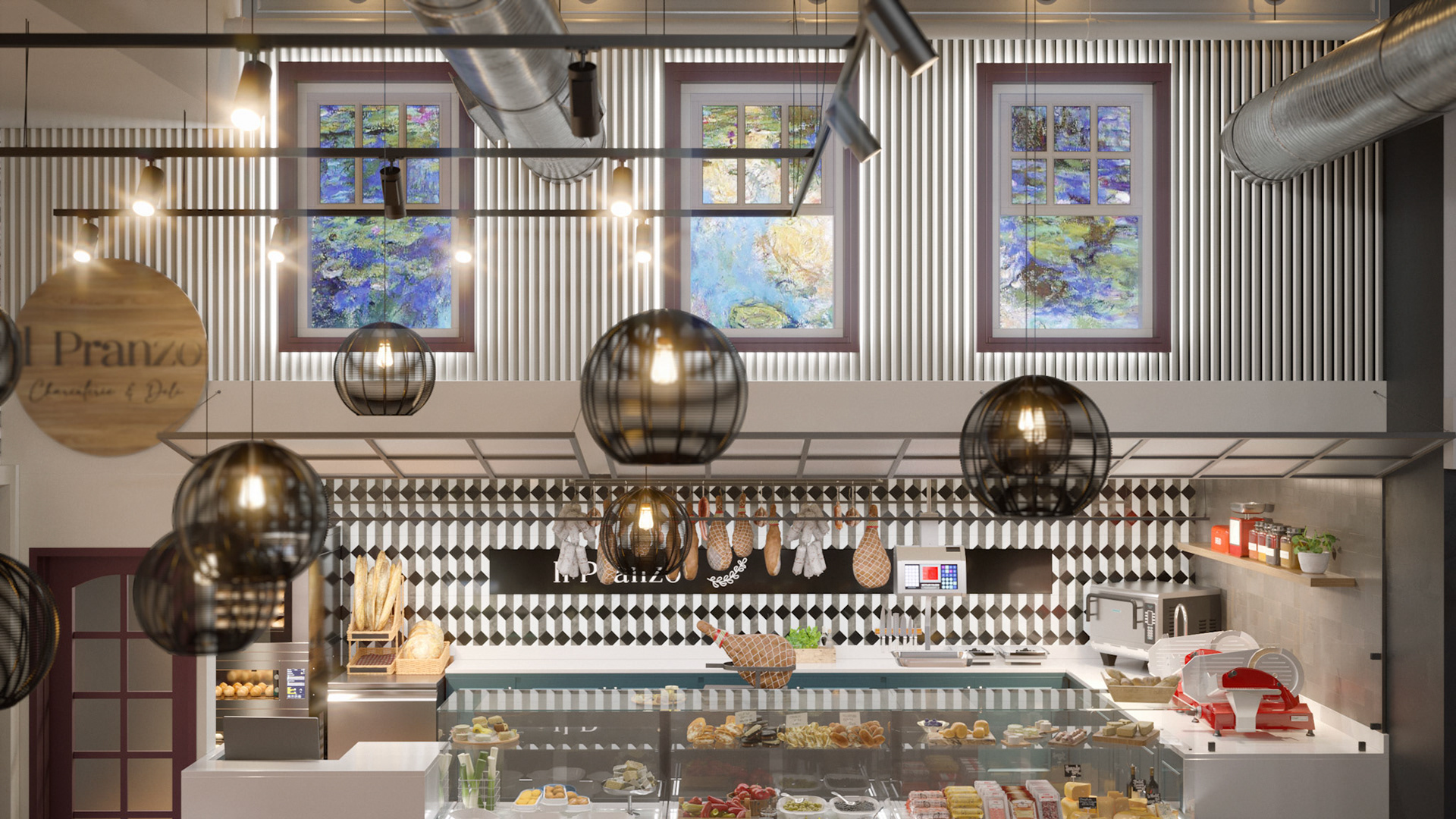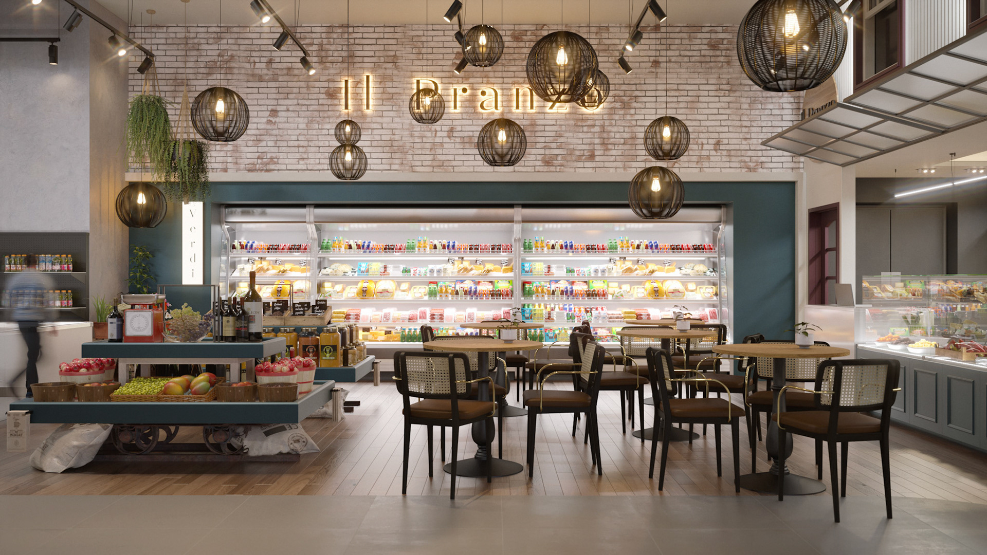 Situated within a separate zone of the same commercial footprint as Salumeria, Il Pranzo serves as a distinct variation of the project's culinary typology. Diverging from the industrial theme of its counterpart, this intervention adopts a classical European design language. The scope is significantly expanded to accommodate a multifaceted program, which includes retail gondolas, a sandwich exhibition counter, a table service area, and an integrated boutique flower shop.