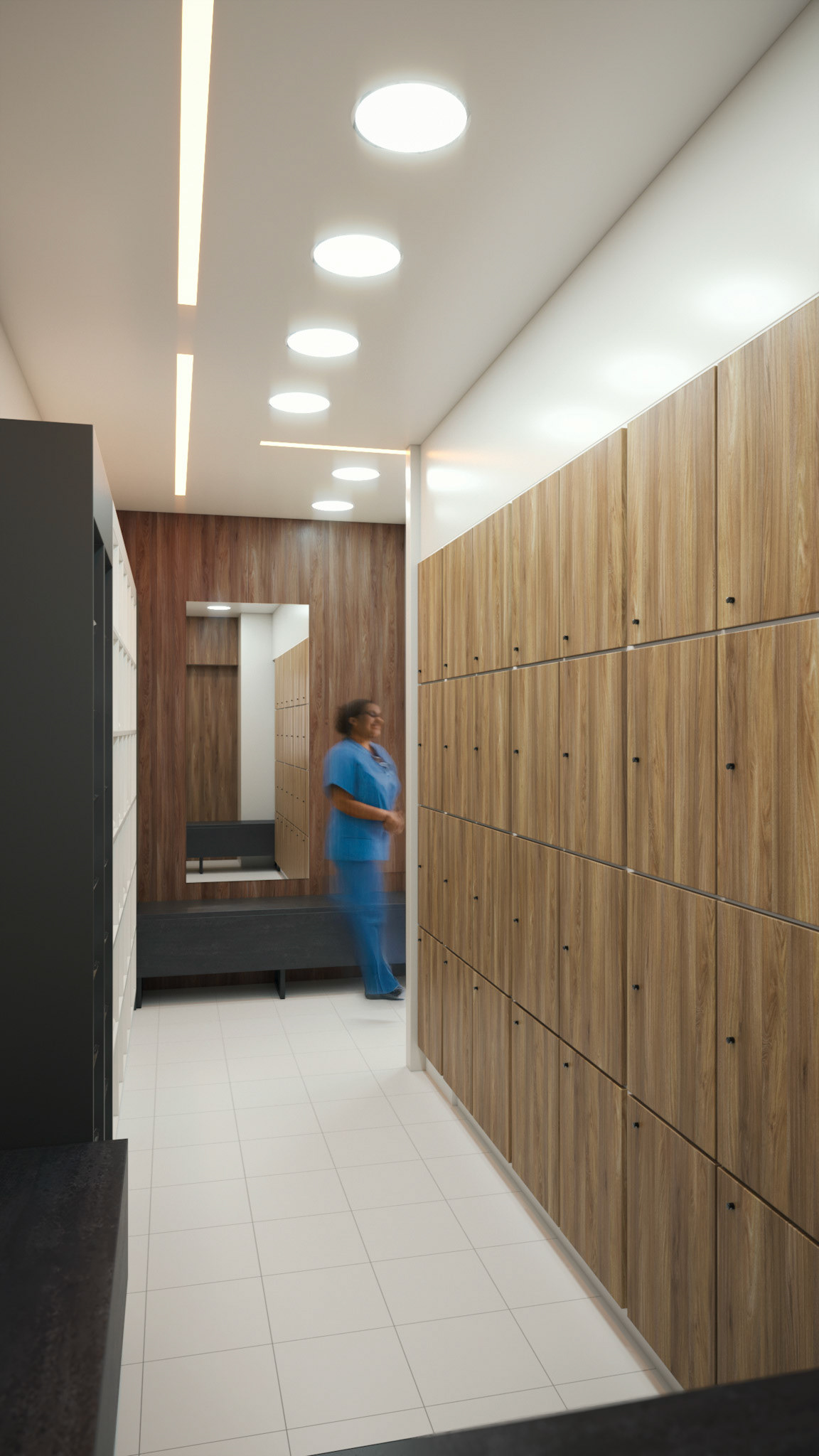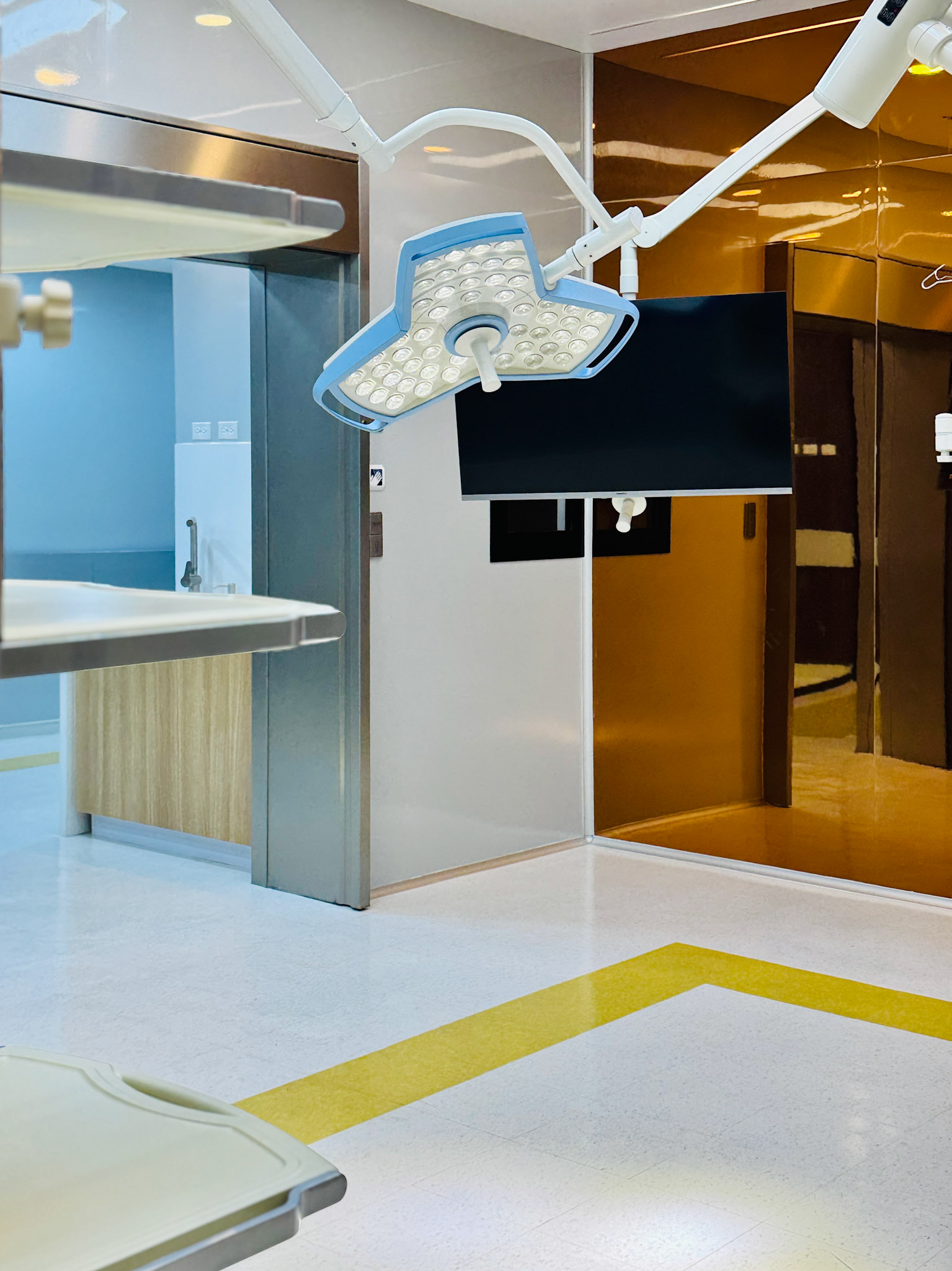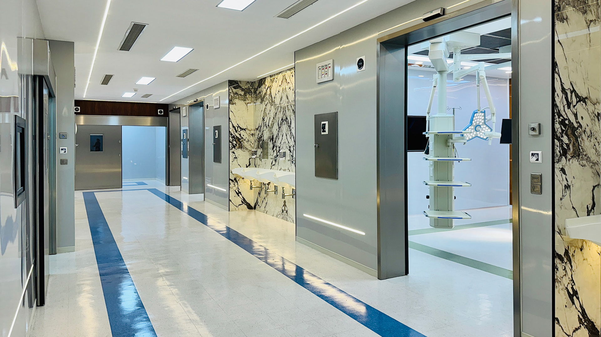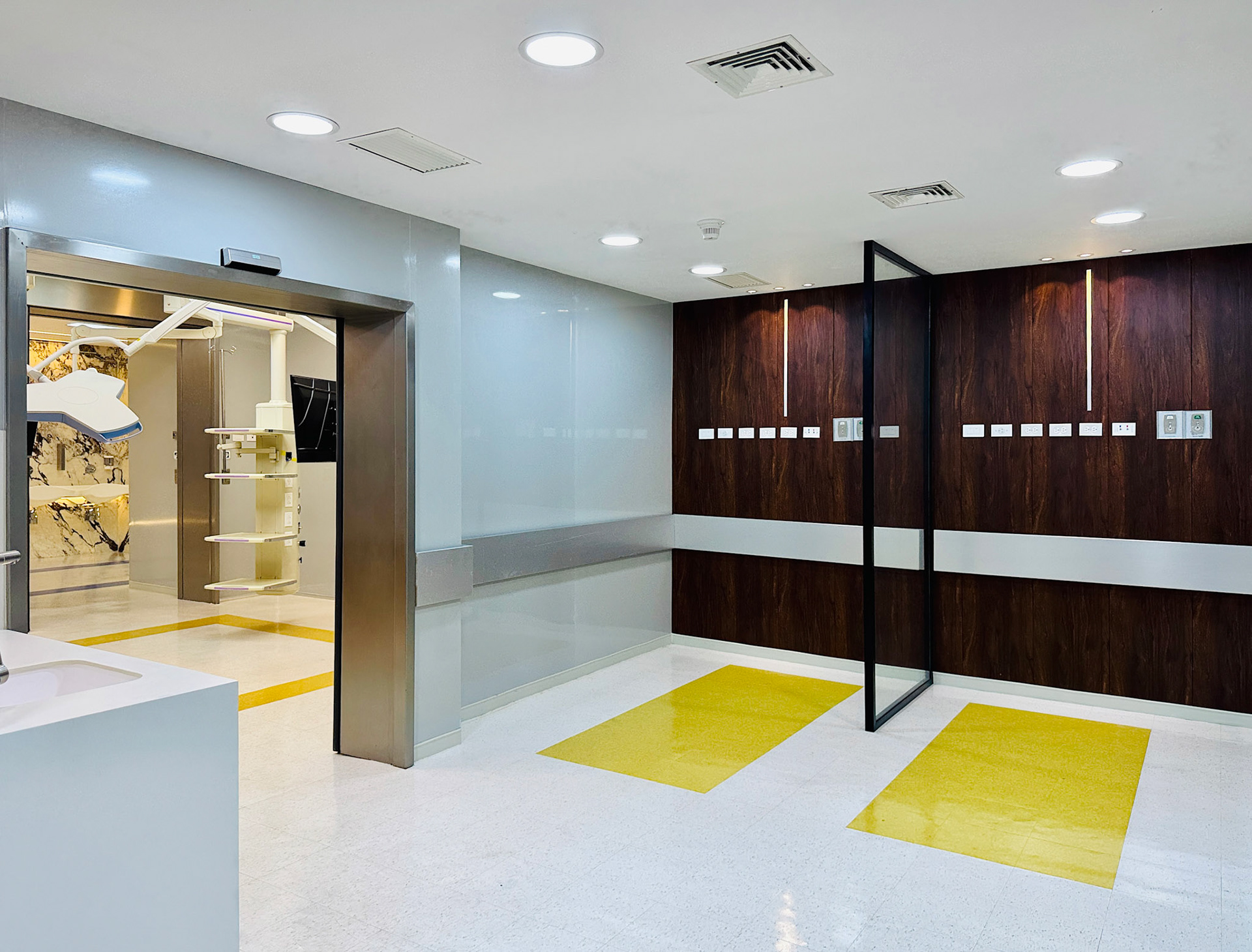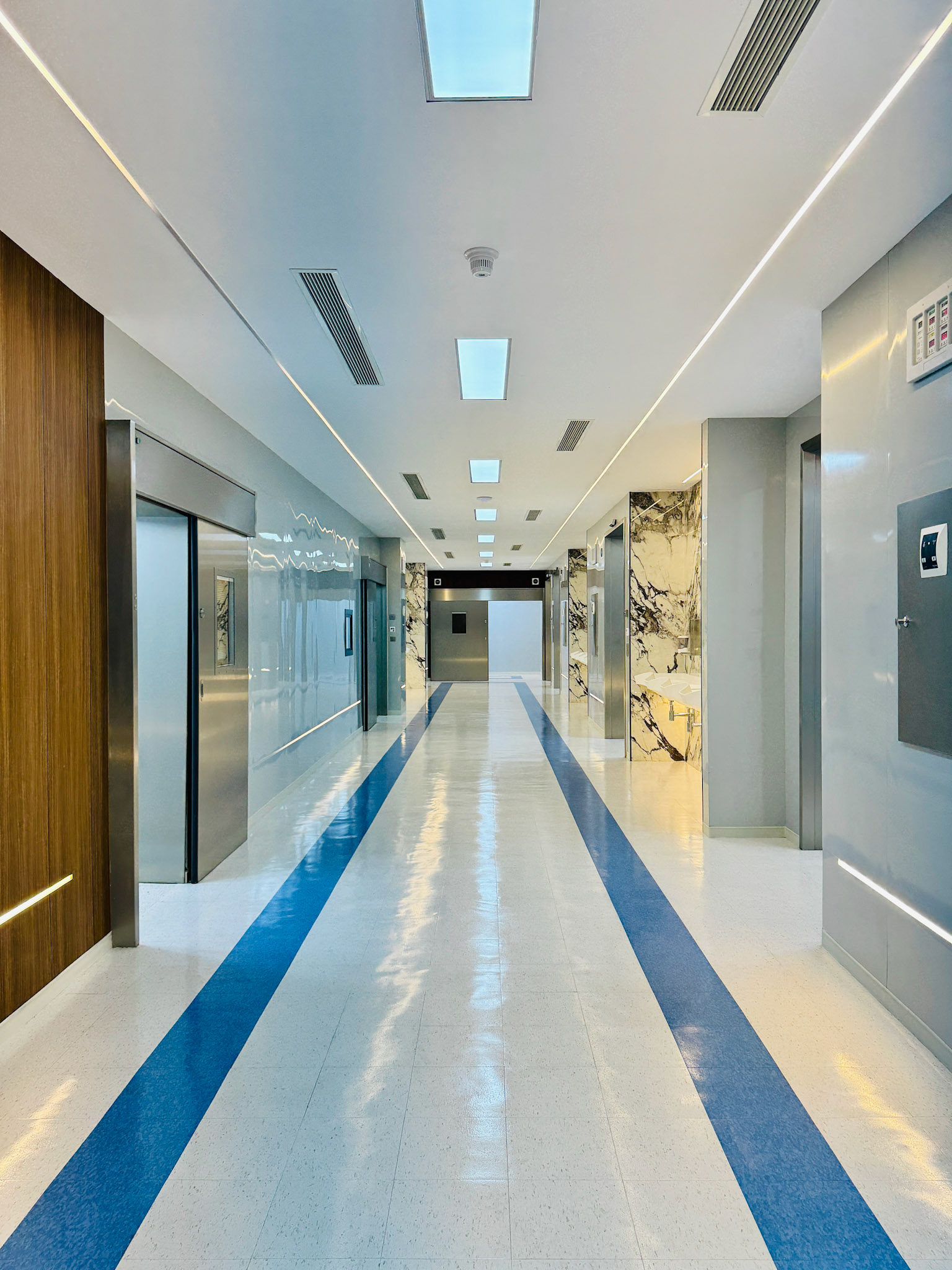 As the flagship department of the hospital, UQ represents the facility's Surgical Ward, engineered to accommodate high-complexity interventions. The architectural program comprises seven high-specification operating theaters, each offering over 25m² of surface area, supported by a dedicated recovery wing with eight beds and two postpartum stations. The design strategy departs from standard clinical aesthetics, employing a clean, minimalist base elevated by a sophisticated material palette. The interior features high-contrast wood and exotic stone detailing, while the operating theaters are distinguished by bold copper accents and a dynamic lighting scheme, solidifying UQ as the "main event" of the complex.