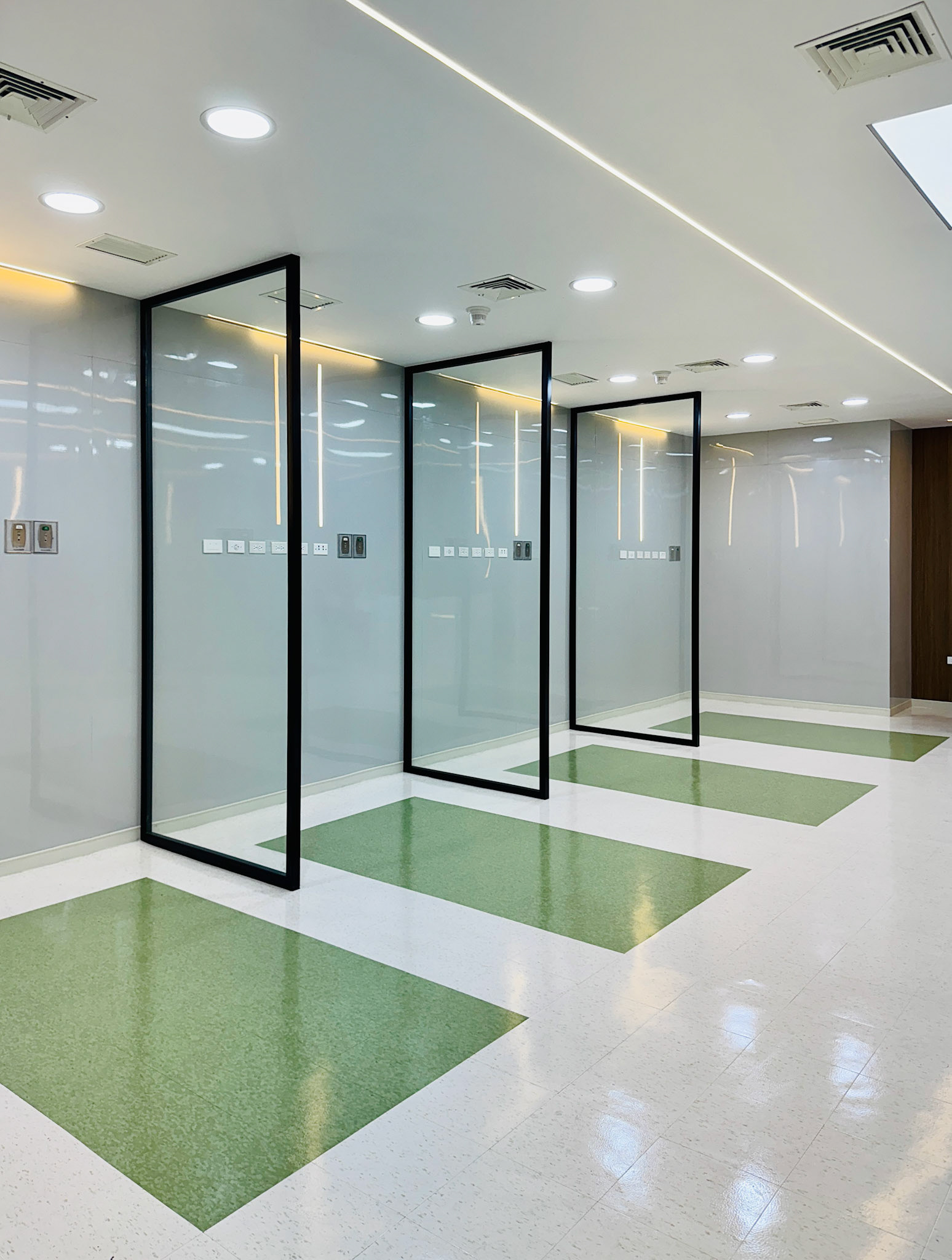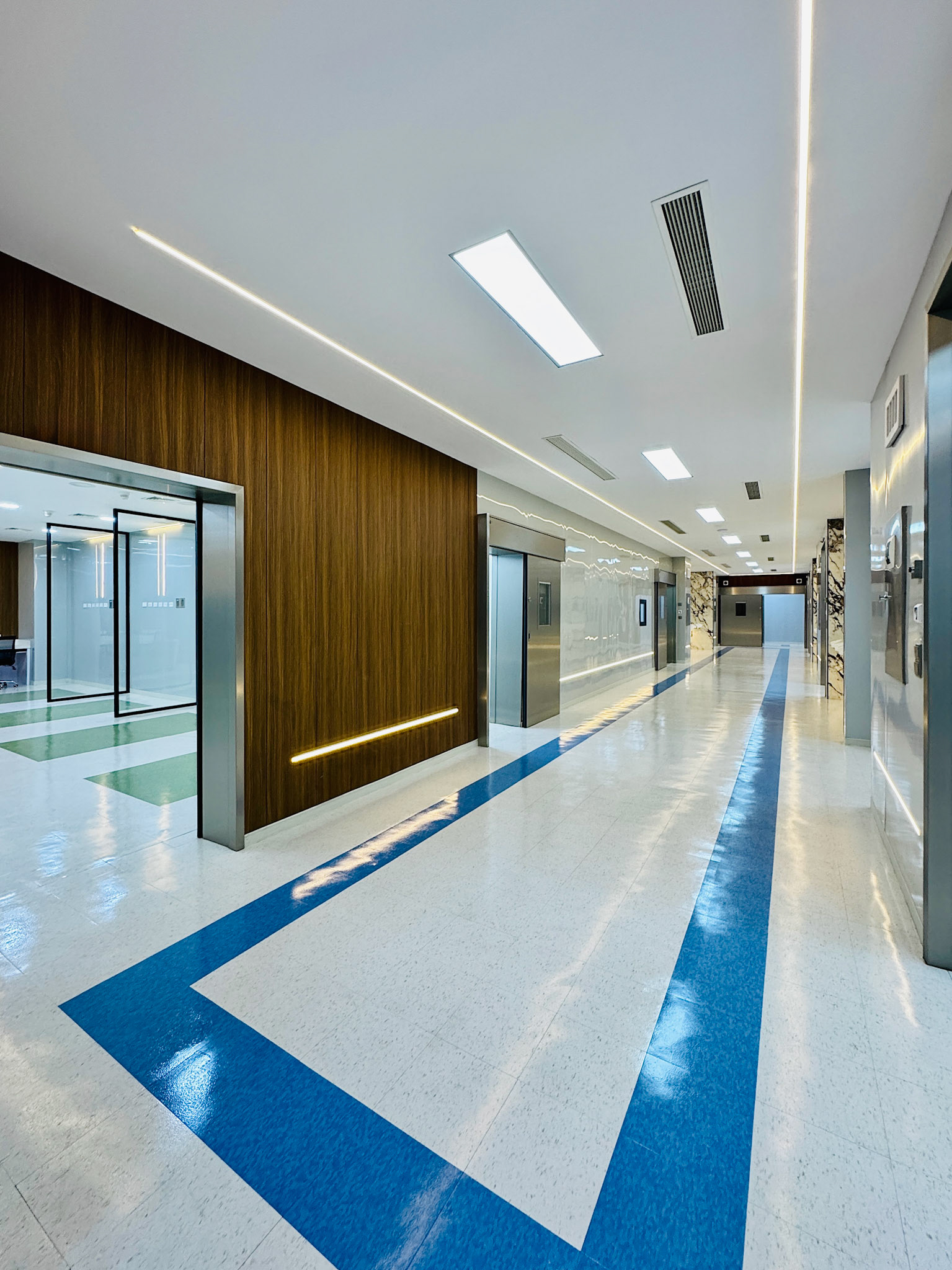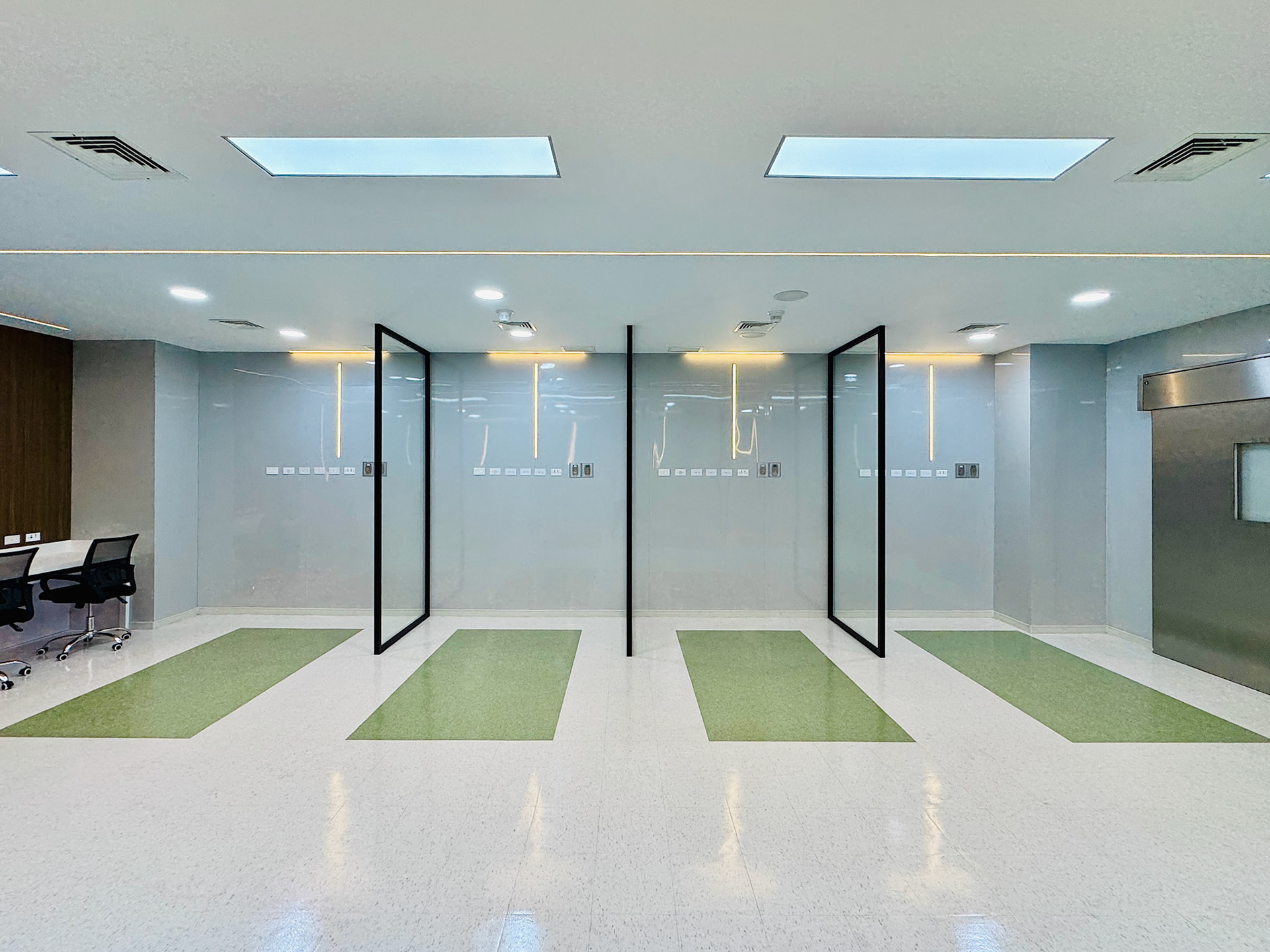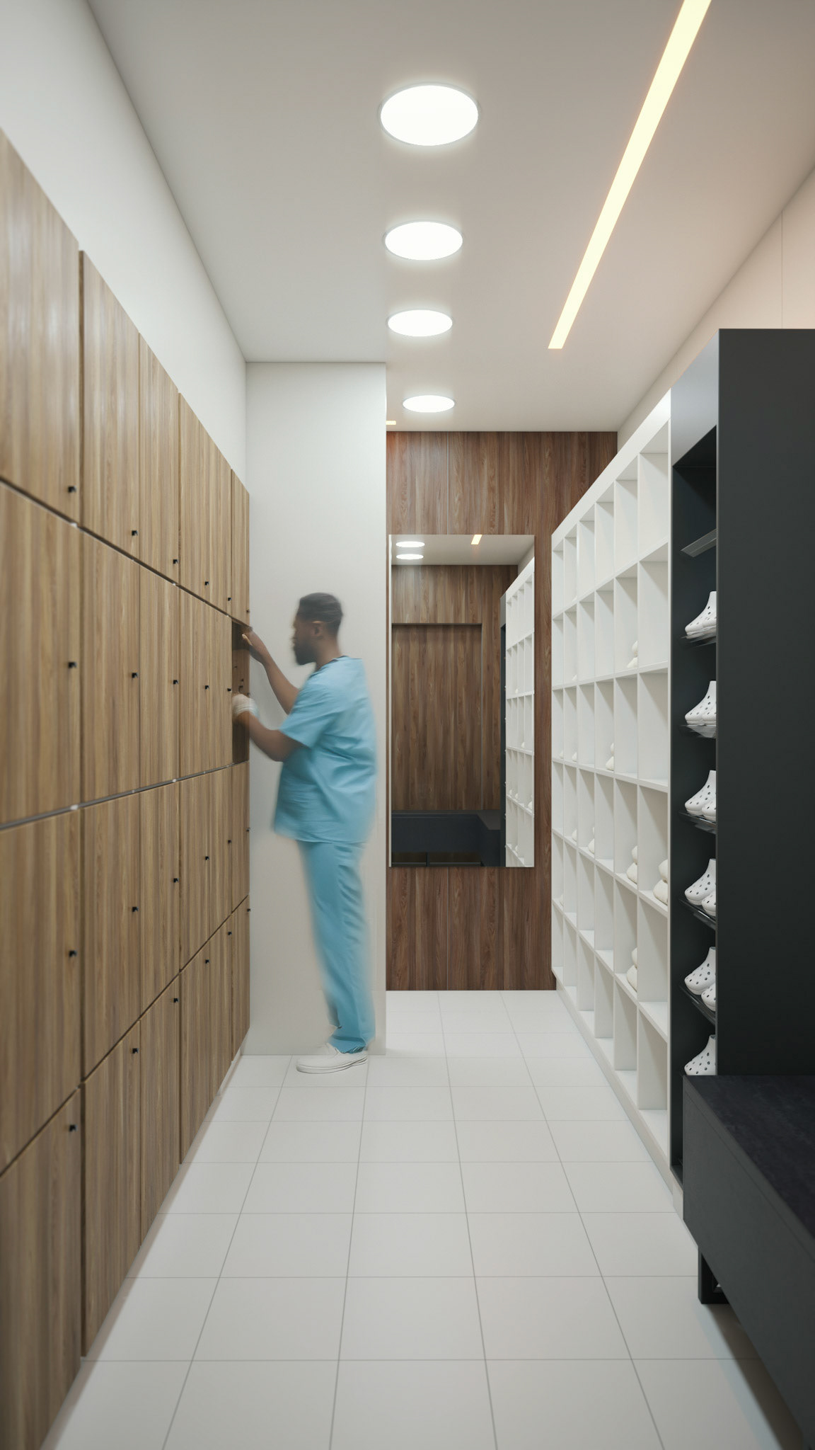 As the flagship department of the hospital, UQ represents the facility's Surgical Ward, engineered to accommodate high-complexity interventions. The architectural program comprises seven high-specification operating theaters, each offering over 25m² of surface area, supported by a dedicated recovery wing with eight beds and two postpartum stations. The design strategy departs from standard clinical aesthetics, employing a clean, minimalist base elevated by a sophisticated material palette. The interior features high-contrast wood and exotic stone detailing, while the operating theaters are distinguished by bold copper accents and a dynamic lighting scheme, solidifying UQ as the "main event" of the complex.