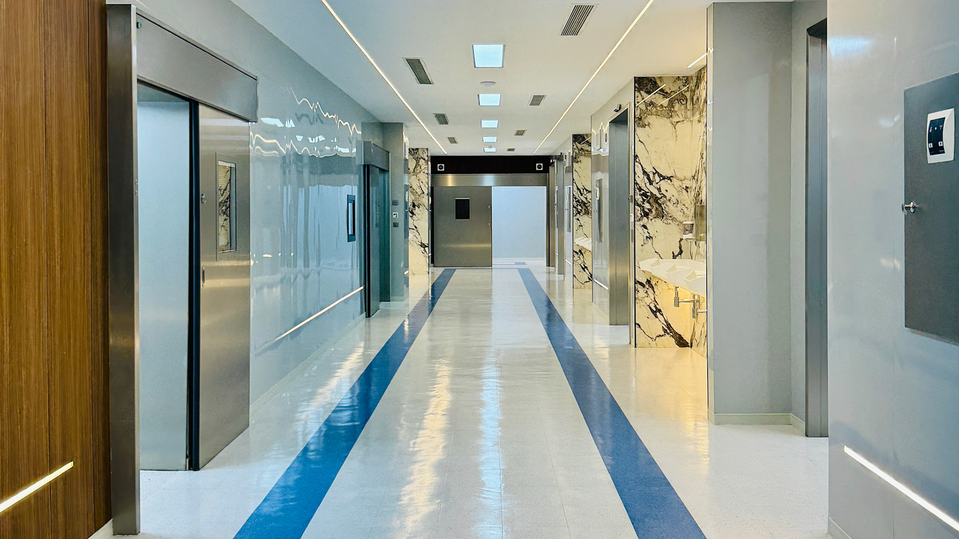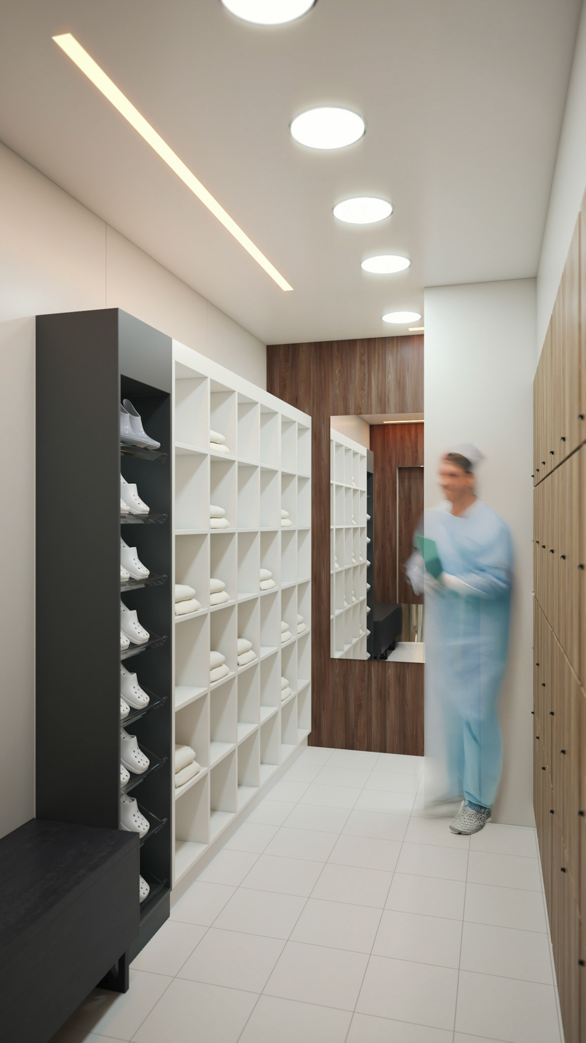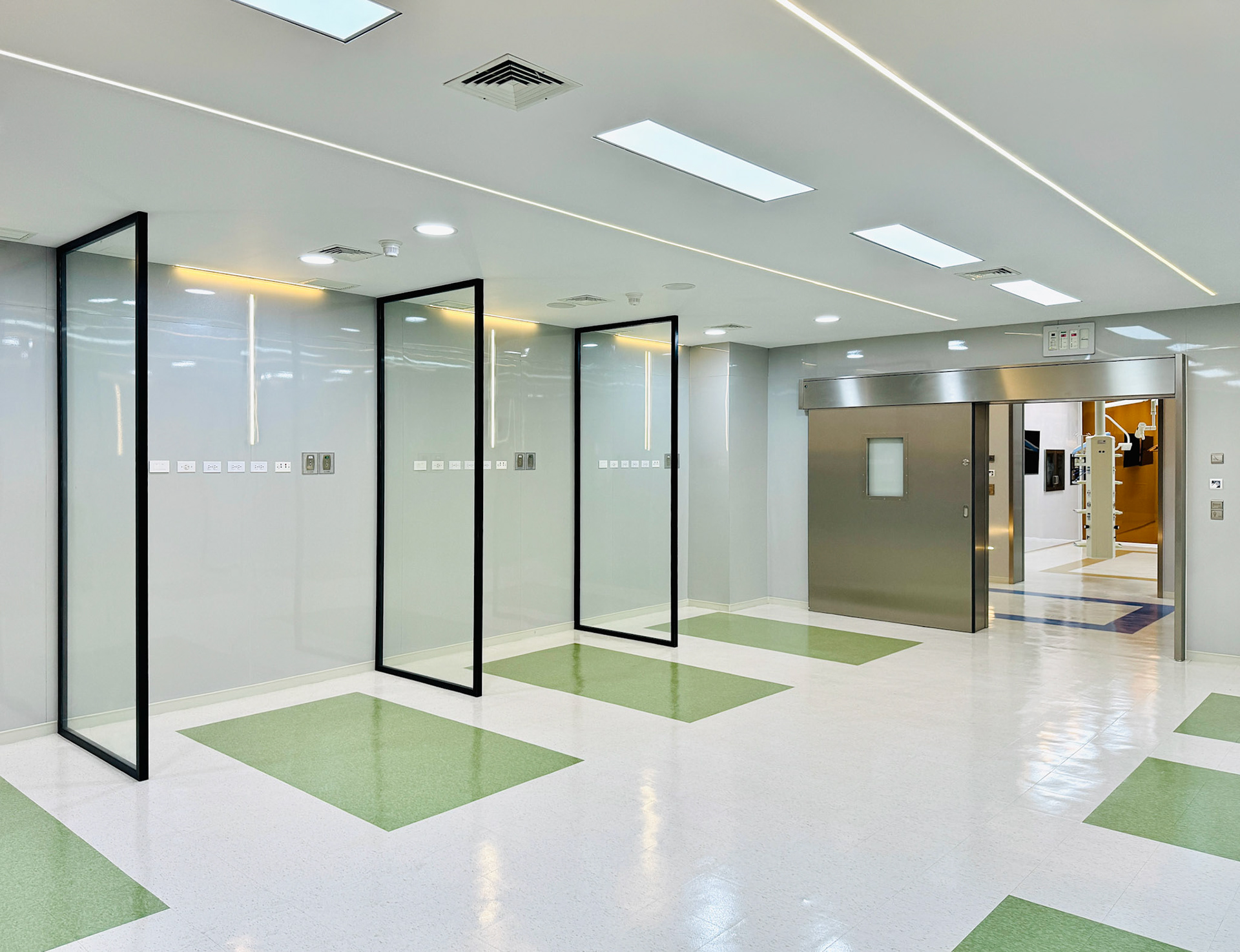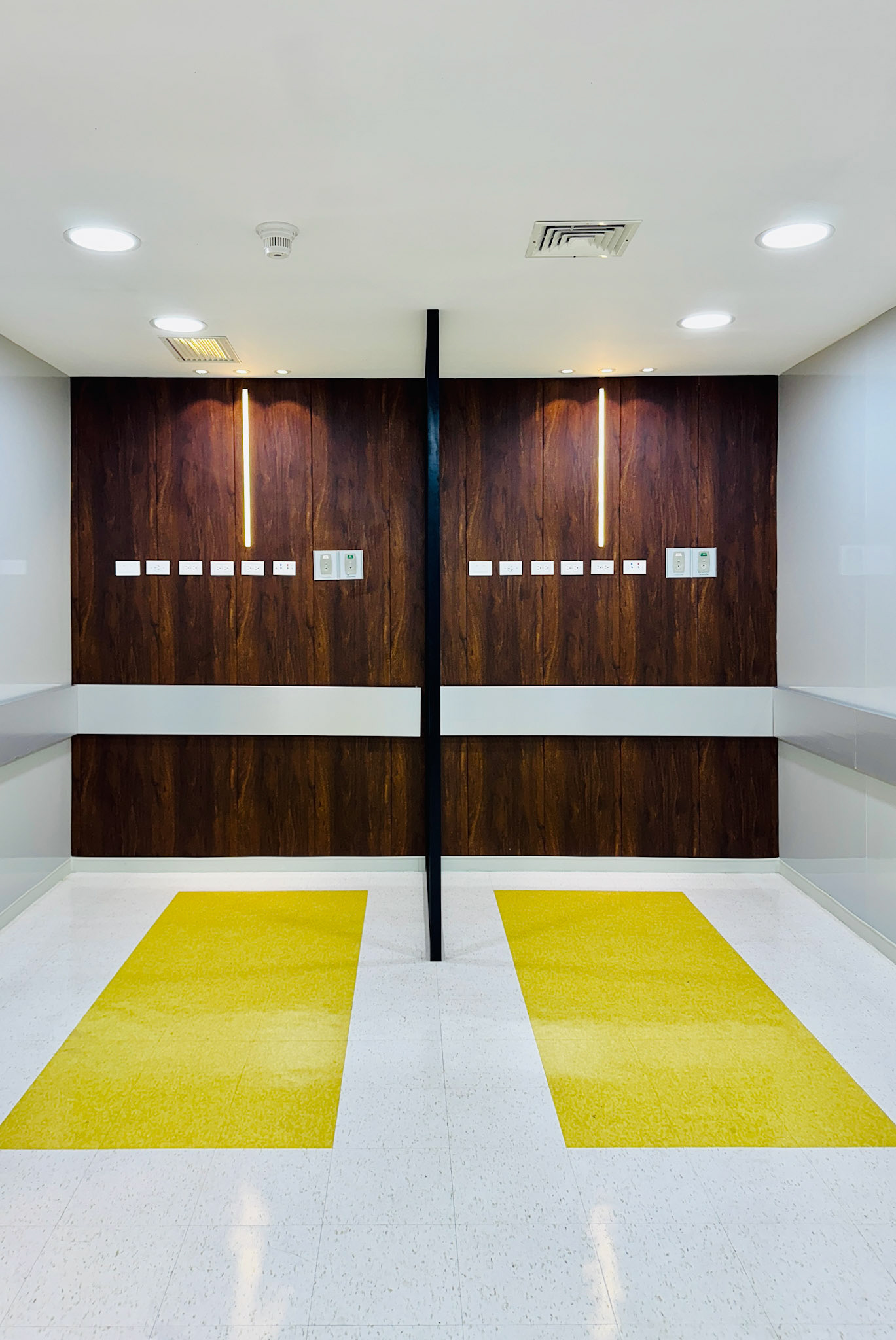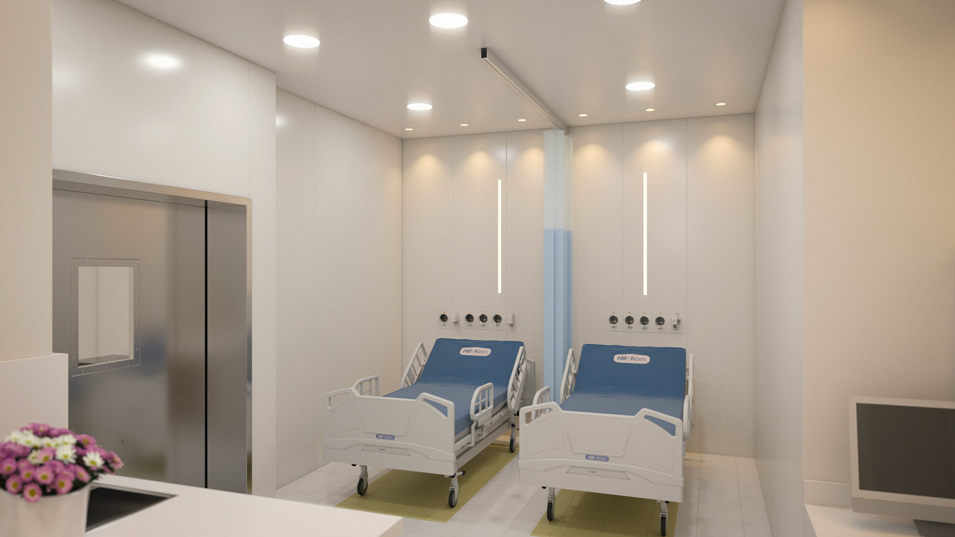 As the flagship department of the hospital, UQ represents the facility's Surgical Ward, engineered to accommodate high-complexity interventions. The architectural program comprises seven high-specification operating theaters, each offering over 25m² of surface area, supported by a dedicated recovery wing with eight beds and two postpartum stations. The design strategy departs from standard clinical aesthetics, employing a clean, minimalist base elevated by a sophisticated material palette. The interior features high-contrast wood and exotic stone detailing, while the operating theaters are distinguished by bold copper accents and a dynamic lighting scheme, solidifying UQ as the "main event" of the complex.